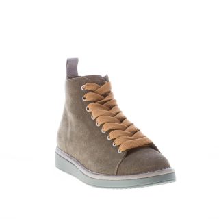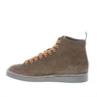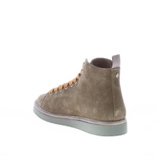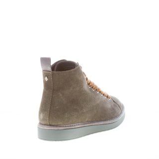 Polacchino della linea P01 realizzato in pelle scamosciata grigio khaki con lacci nocciola. Lacci di ricambio grigi inclusi. Fodera interna in microfibra. Plantare removibile. Suola in gomma. Altezza 2,7 cm