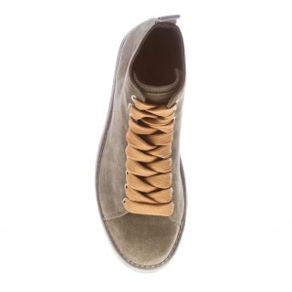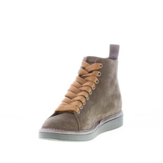 Khaki suede P01 laced ankle boot with walnut laces and internal microfibre lining. Grey laces included. Removable internal footbed. Rubber outsole with 2,7 cm height