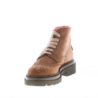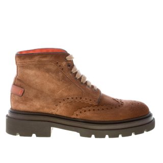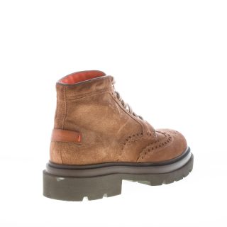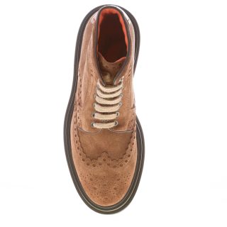 Brown fine suede laced ankle boot with the classic brogue detailing. Branded leather patch stitched at the heel. Thick leather midsole. Rubber sole