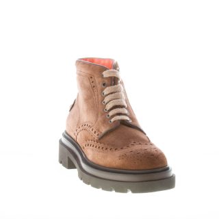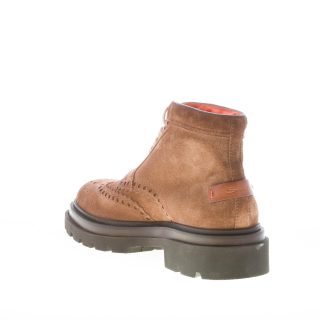 Scarponcino allacciato in crosta marrone con le classiche impunture e cuciture brogues. Patch in pelle con logo cucita al tallone. Suola intermedia in cuoio e suola