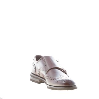Brown vintage leather completely made in Italy double monk strap shoe with the classic wingtip brogues details throughout. Exposed stitching at welt. Rubber sole with leather midsole