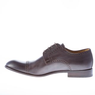 Dark brown leather derby dress shoe. Perforated cap toe. Leather sole