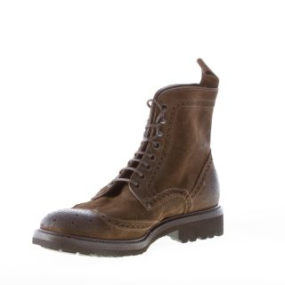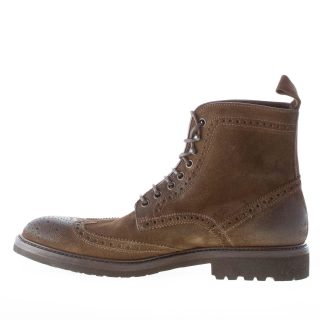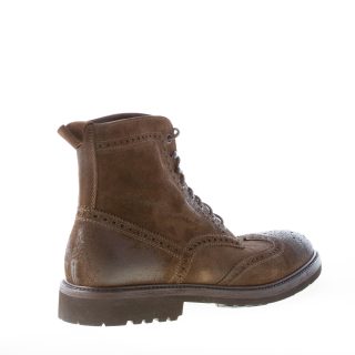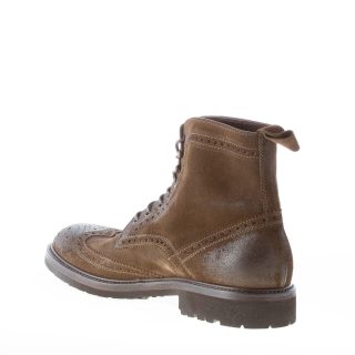 Olive green vintage suede laced ankle boot with classical wingtip detailing. Exposed stitchings throughout. Rubber sole