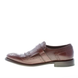 Dark brown leather monk strap shoes with classical wingtip brogues detailing. The upper is embellished with a kiltie flap decorated with a buckled strap and a scalloped edge. Goodyear leather sole