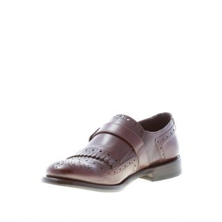 Scarpa con fibbia in pelle testa di moro con impunture in stile classico wingtip brogues. La parte superiore è abbellita da una maxi frangia con dettaglio smerlato ed un cinturino con fibbia regolabile. Suola in cuoio con costruzione Goodyear