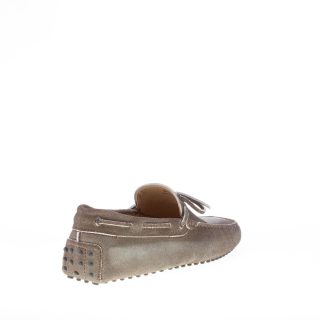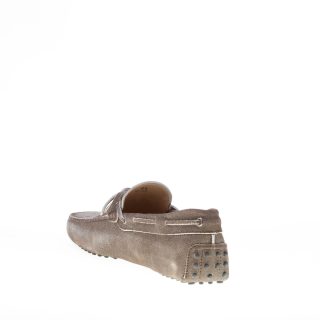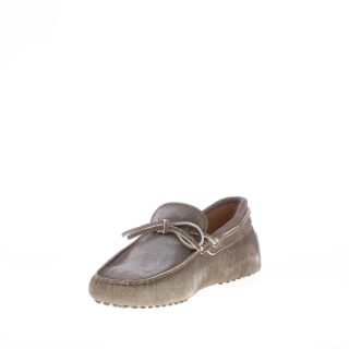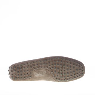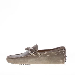 Mocassino driver in camoscio testa di moro “delavé” con laccetto passante. Cuciture in rilievo. Monogramma Tod’s impresso. Iconica suola con gommini