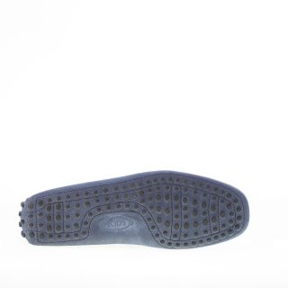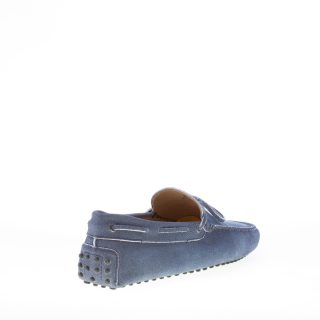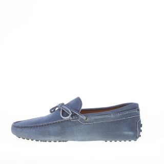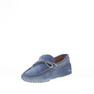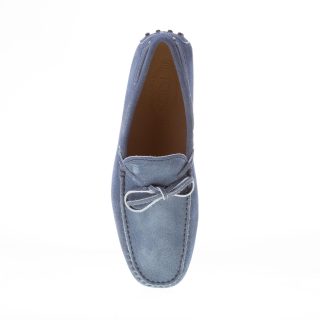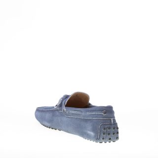 Mocassino driver in camoscio blu “delavé” con laccetto passante. Cuciture in rilievo. Monogramma Tod’s impresso.