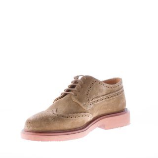 Scarpa allacciata modello derby in camoscio marrone. Dettagli con impunture in stile wingtip brogue. Suola light in micro a contrasto