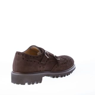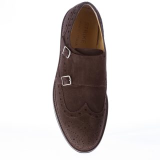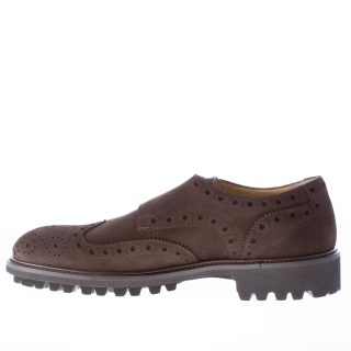 Dark brown suede wingtip style double monk strap shoes. Light rubber sole
