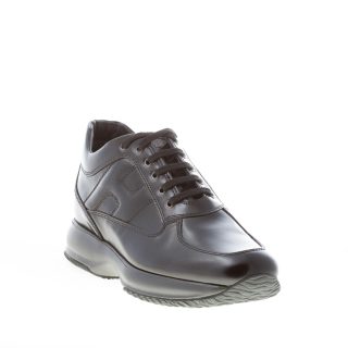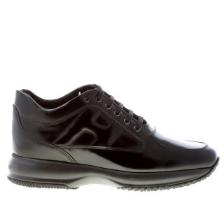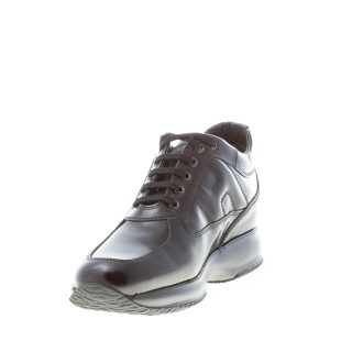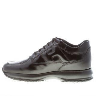Interactive black semi-glossy leather sneaker with exposed stitchings throughout and the classical padded Hogan monogram at sides. Removable internal footbed 2 cm. Rubber sole