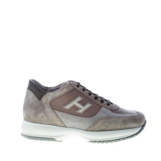 Sneaker Interactive in camoscio e tessuto canvas grigio con talloncino in pelle nera a contrasto. Monogramma Hogan cucito ai lati. Fussbett interno removibile di 2 cm. Suola in gomma