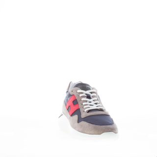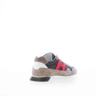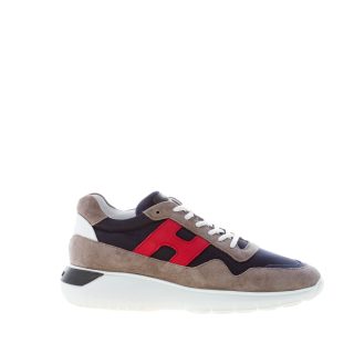 Interactive Cube taupé color suede and blue nylon fabric sneaker with white rubberized leather detail at back. Black branded rubber label at tongue. Hogan monogram stitched on one side in red leather. Removable memory foam insole 0,8 cm. Rubber sole with back black logo detail.