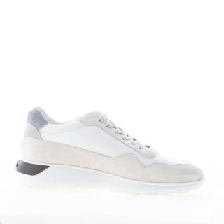 Sneaker Interactive Cube realizzata in un mix di camoscio beige e tessuto tecnico bianco con talloncino in camoscio grigio. Etichetta logo in gomma sulla linguetta. Monogramma Hogan cucito a lato in nabuk blu. Soletta interna in memory foam di 0,8 cm. Suola rialzata in gomma con dettaglio logo posteriore su spoiler nero