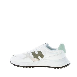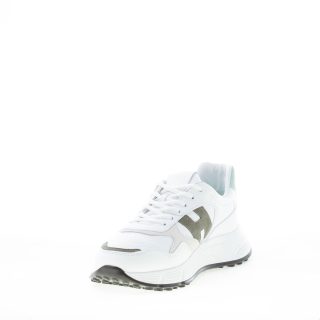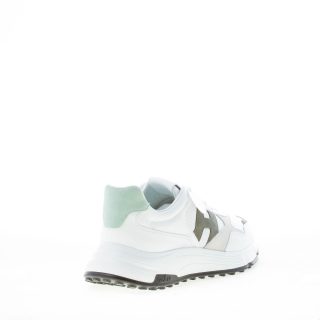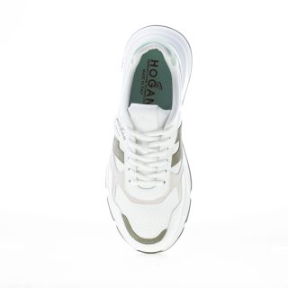 Hyperlight white soft leather sneaker with green and light grey suede details. Stitched green suede Hogan logo at sides. Suede detail at back. Internal memory foam footbed 0,8 cm. Lightweight rubber sole with 4,5 cm height.