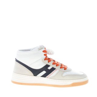 Sneaker alta Hogan H630 realizzata in pelle bianca e camoscio tortora. Monogramma brand Hogan in un lato in pelle blu con forma allungata. Dettagli e impunture colore tabacco. Fussbett interno in memory foam di 0,9 cm. Suola in gomma con altezza totale di circa 3,8 cm e con il nuovo logo HGN86