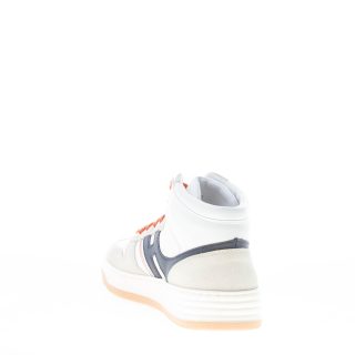 Hogan H630 High Top sneaker made in a mix of white leather and light grey suede. Stiched Hogan monogram on side made in blue leather with an enlongated shape. Tobacco brown stitchings detail. Padded insert at the ankle. Internal memory foam footbed 0,9 cm. Rubber sole with 3,8 cm height and with the new HGN86 logo