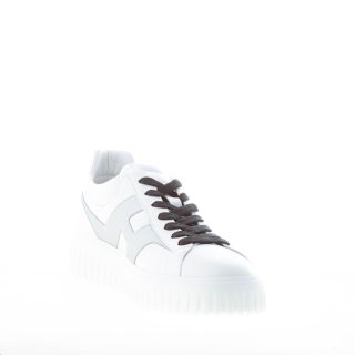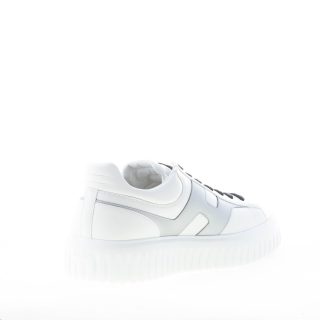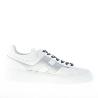 Sneaker Hogan H-STRIPES realizzata in morbida nappa bianca con talloncino imbottito. Monogramma brand Hogan imbottito ai lati in pelle argento con forma allungata e impunture. Fussbett interno in memory foam di 0,8 cm. Suola in Eva extralight con righe verticali con altezza totale di circa 4,8 cm