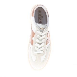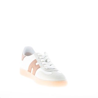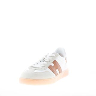 Sneaker Hogan Cool realizzata in pelle bianca con maxi monogramma Hogan dentellato a lato in pelle cuoio. Talloncino in pelle cuoio e dettagli in camoscio beige. Fussbett removibile di 1,6 cm. Suola cassetta in gomma con altezza totale di 2,8 cm
