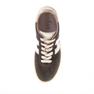Black suede Hogan Cool sneaker with a maxi cream leather indented Hogan monogram on sides. Beige suede detail at back. Internal removable footbed 1,6 cm. “Cassetta” contrasting rubber sole with a total 2,8 cm height