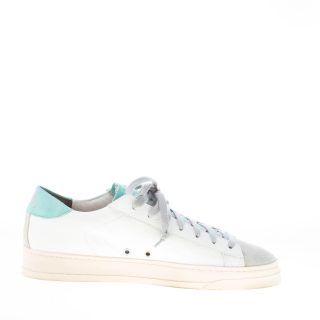 Sneaker P448 modello Jack realizzata in un mix di pelle bottalata bianca e camoscio grigio e acquamarina. Talloncino personalizzato. Allacciatura grigia. Logo brand microforato a lato. Suola in gomma effetto usato