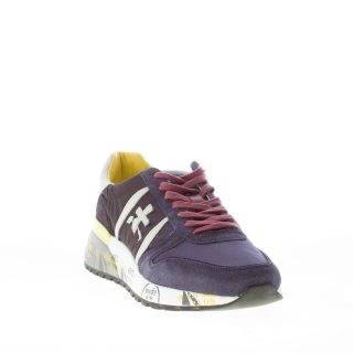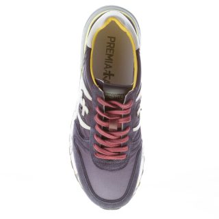 Sneaker Premiata Lander 4948 realizzata in camoscio e tessuto nylon blu. Iconico logo in pelle grigio chiaro in rilievo ai lati. Fussbett estraibile interno di 1 cm. Talloncino in pelle grigio chiaro. Dettagli gialli e bordeaux. Suola in gomma rialzata multicolore di 4 cm con le tipiche stampe graffiti del brand