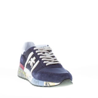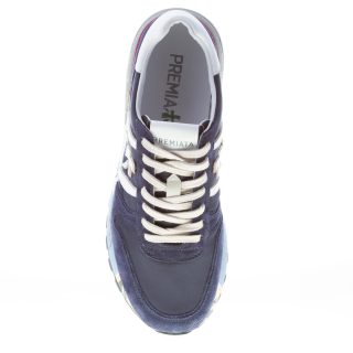 Sneaker Premiata Lander 5675 realizzata in camoscio e tessuto nylon blu. Iconico logo in pelle bianca in rilievo ai lati. Fussbett estraibile interno di 1 cm. Talloncino in pelle bianca. Suola in gomma rialzata multicolore di 4 cm con le tipiche stampe graffiti del brand