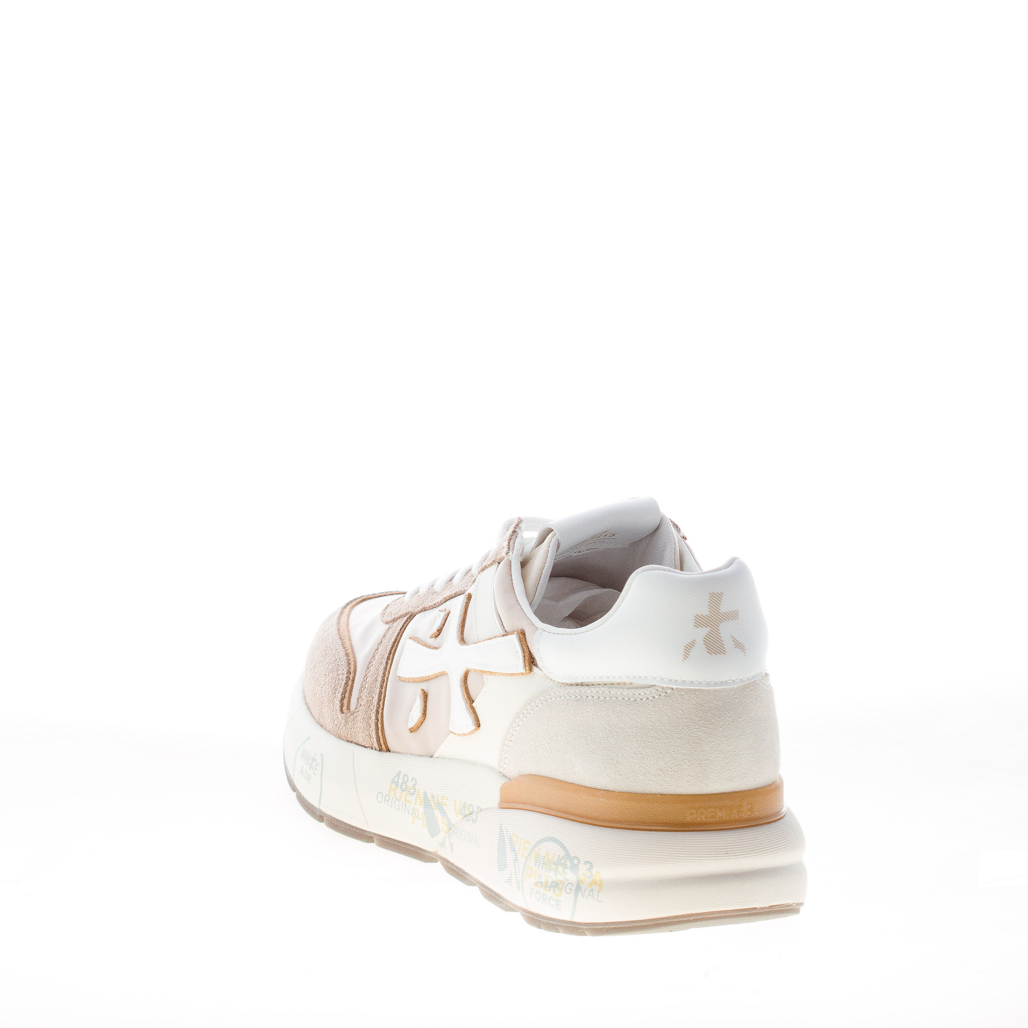 Sneaker Premiata Mick 7213 in un mix di camoscio e tessuto nylon beige con inserti in pelle. Talloncino in pelle bianca. Inserto in gomma