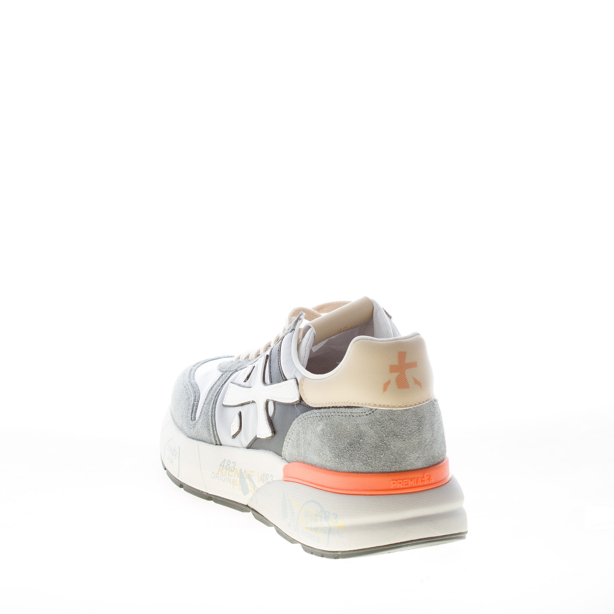 Sneaker Premiata Mick 7245 in un mix di camoscio e tessuto nylon grigio con inserti in pelle nera. Talloncino in pelle beige. Inserto in gomma al tallone con brand. Applicazioni in pelle bianca ai lati con l’iconico logo in rilievo. Suola in gomma rialzata con le tipiche stampe graffiti del brand