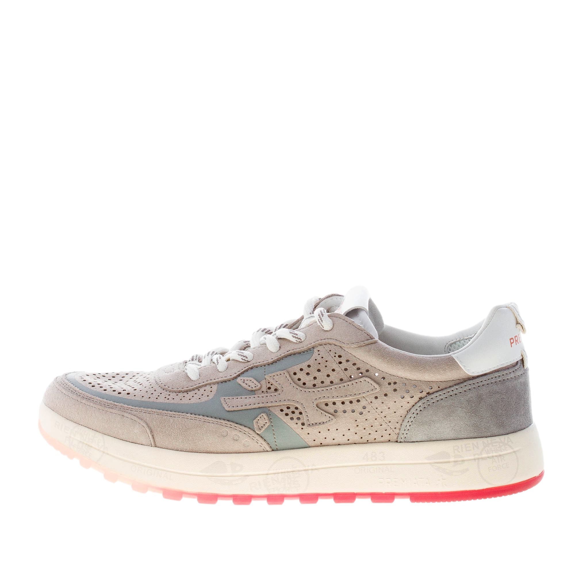 Nous 7223 sneaker made in grey suede with perforations throughout and fabric details. Iconic brand logo at sides. Contrasting white leather detail at back. Rubber sole with the typical graffiti prints of the brand