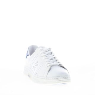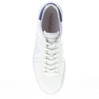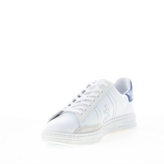 White leather RUSSEL 6274 sneaker with blue leatherbranded detail at back. Iconic blue micro-seams logo at sides. Rubber sole with the typical prints of the brand