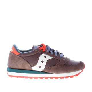 Sneaker uomo Jazz Original in tessuto nylon e camoscio grigio scuro con dettagli in pelle bianca e blu teal. Stampa brand sul tallone e sulla linguetta. Suola in gomma bicolore leggera.