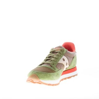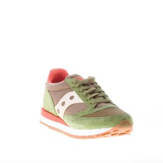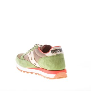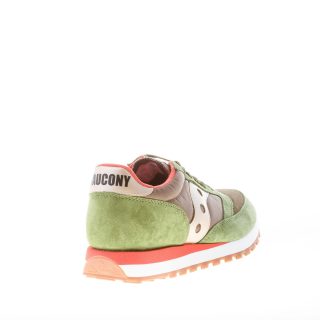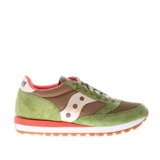 Sneaker Jazz 81 in tessuto tecnico e camoscio verde con dettagli in pelle oro e rifiniture arancioni. Stampa brand sul tallone e sulla linguetta. Linguetta originale del 1981. Nuovo sottopiede completamente ammortizzato. Suola in gomma leggera multicolore.