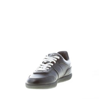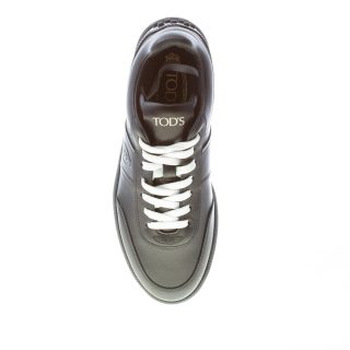 Black fine leather Tod`s Tabs sneaker with the brand logo engraved at side and the iconic gommini detail at the heel. White contrasting lacing with black laces included in the packaging. Rubber “cassetta” sole