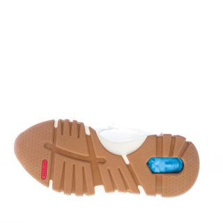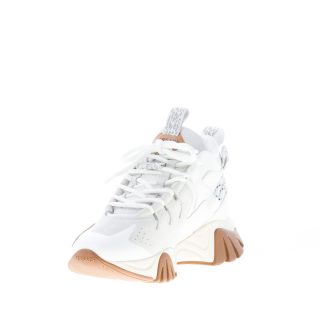 “Squalo Hiker” sneaker inspired by the white shark anatomy and featuring a mix of white leather, suede and various tech fabrics panels with light grey details. Logo label on the tongue and Gianni Versace signature printed at side. Massive rubber sole evoking the shark jaws. Medusa detail hidden in the outsole