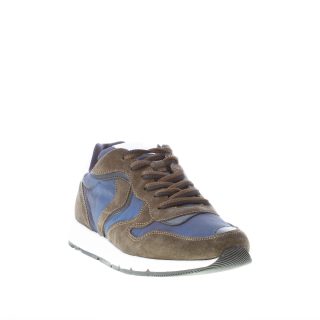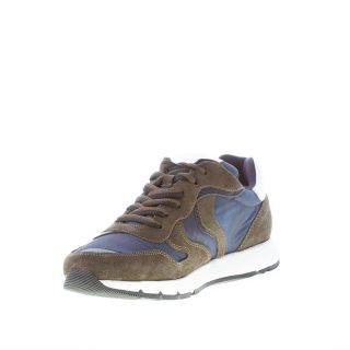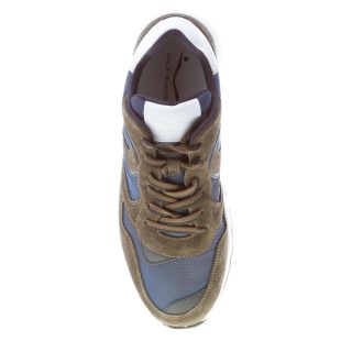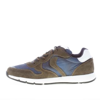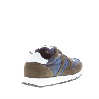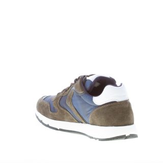 Sneaker Jave in camoscio verde militare e tessuto tecnico blu. Dettagli in pelle bianca con logo sulla linguetta e sul tallone. Suola in gomma