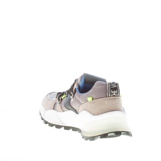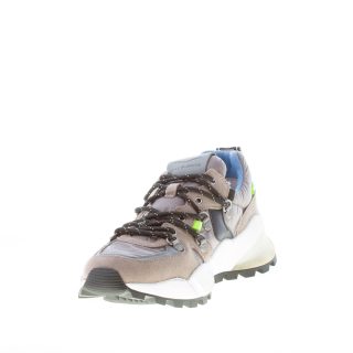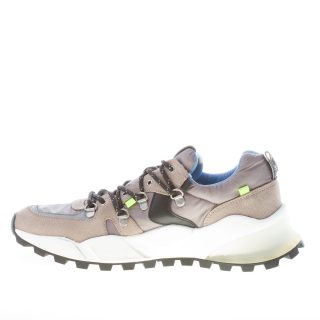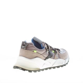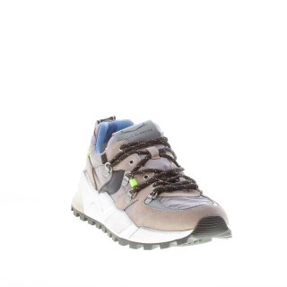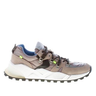 Sneaker Club10 realizzata in un mix di tessuto tecnico e camoscio grigio piombo e beige. Allacciatura con lacci tubolari ed occhielli metallici hiking. Etichetta in pelle con logo sulla linguetta. Suola rialzata in Eva e gomma