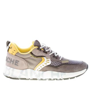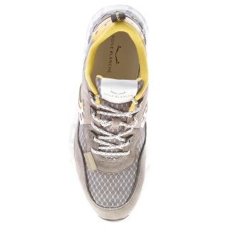 Sneaker Club01 realizzata in un mix di pannelli sovrapposti multicolore in camoscio, pelle, tessuto tecnico. Camoscio e tessuto tecnico a nido d’ape grigio con inserti in pelle bianca e gialla. Brand logo in lettering tridimensionale di gomma applicato al tallone. Allacciatura a contrasto con occhielli hiking. Serigrafia logo “spray effect” sulla suola rialzata in Eva e gomma