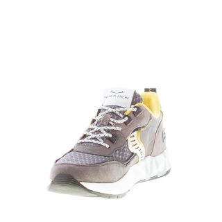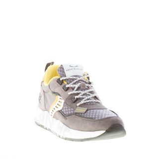 Club01 panelled sneaker featuring a mix of multicolor suede, leather, fabric panels. Grey suede and tech mesh fabric with white and yellow leather inserts. 3D rubber lettering logo at back. White Eva and rubber sole with “spray effect” logo serigraphy