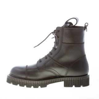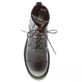 Black soft leather Bernini combat boots with front laces closure, round toe and exposed stitchings. Metal logo plate at tongue and back pull-up with decorative metal ring. Extra-light rubber sole.