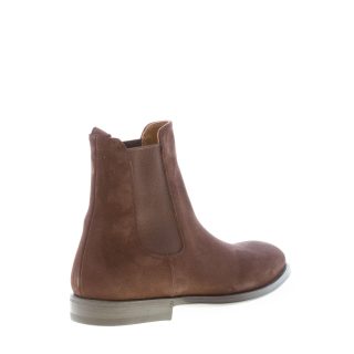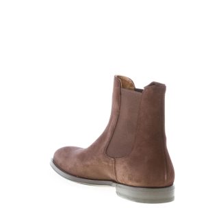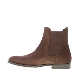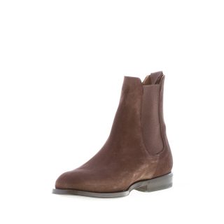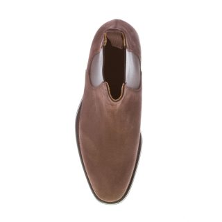 Brown suede lightly enlongated plain toe handmade in Italy chelsea boot. Elastic bands on both sides. Pull up. Exposed stitchings on the welt. Leather sole