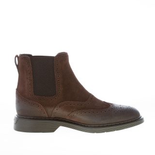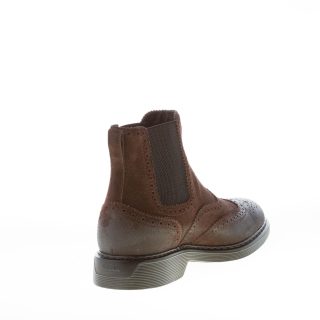Stivaletto Chelsea H576 in camoscio marrone ebano presentato con impunture e cuciture classiche in stile brogue. Inserti elastici laterali per agevolare la calzata. Dettagli vintage sulla punta e al tallone. Nuovo sottopiede removibile in memory foam di 0,8 cm. Suola in gomma leggera. Altezza totale circa 3 cm