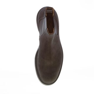Black suede Liverpool chelsea boots with a plain toe. Ease dress elasticized bands at sides. Pull-up at back. Lightweight rubber sole